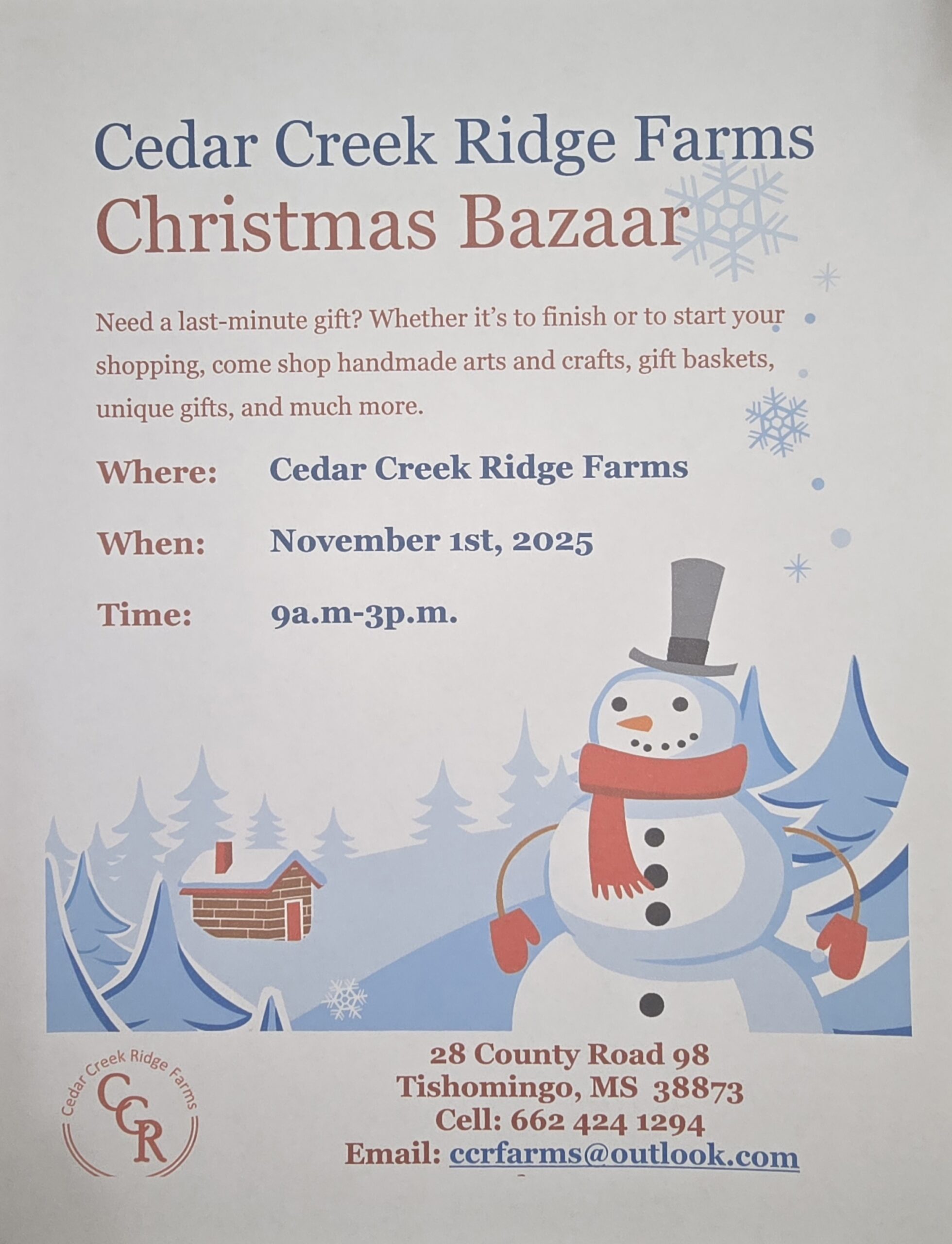 Cedar Creek Ridge 20 cr 98, Tishomingo, MS, United StatesChristmas Bazaar at Cedar Creek Ridge Farms in Tishomingo. Crafts, gifts, sweets, and food. Come out and shop local vendors and grab some good food. 28 Cr 98, Tishomingo, MS 38873 662 424 1294 I have a few vendor spots still available
