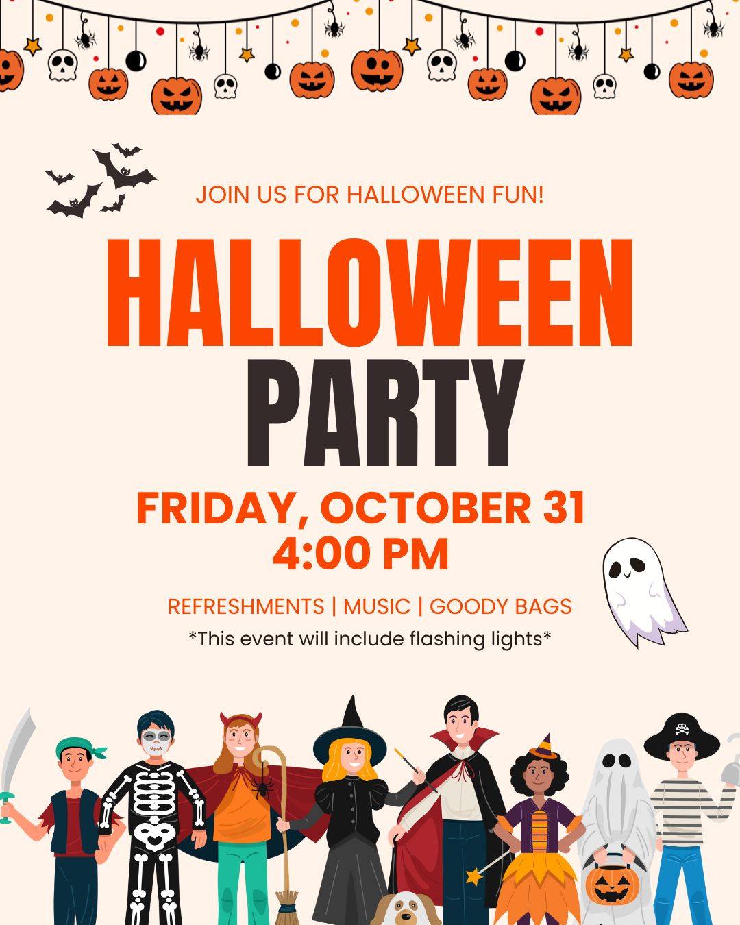 Join us for a frightfully fun time at our Halloween Party! Friday, October 31st at 4 PM We'll have refreshments, music, and goody bags for all your little ghouls and goblins! Sensory Note: This event will include flashing lights Come in costume and celebrate Halloween with us at the library!